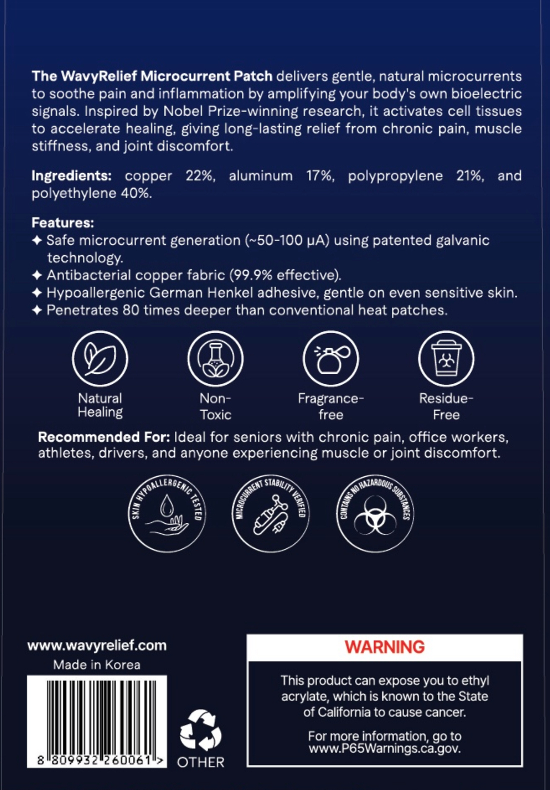 Constructed with antibacterial copper fabric (up to 99.9% effective) and a hypoallergenic adhesive by German Henkel, the Standard patch is safe for sensitive skin, non-toxic, fragrance-free, and leaves no residue. You can wear it comfortably while working, exercising, driving, or resting.